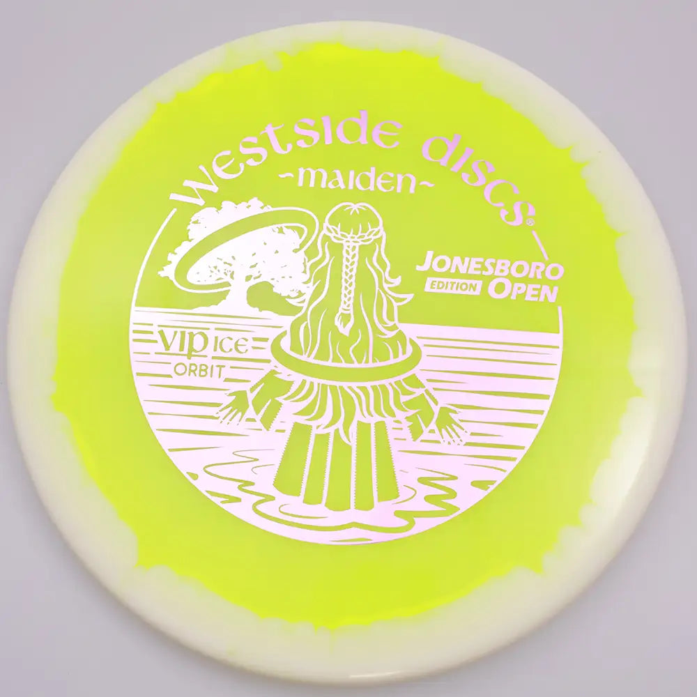 The Westside Discs VIP Ice Orbit Maiden – Jonesboro Open edition is a precision putt and approach disc designed for clean releases, straight flights, and dependable control around the basket. With flight numbers of 3 | 4 | 0 | 1, the Maiden offers a neutral flight that holds the line you put it on while finishing with a gentle, reliable fade. Its comfortable shallow profile and beadless feel make it a favorite for confident putting, smooth approach shots, and controlled short drives.